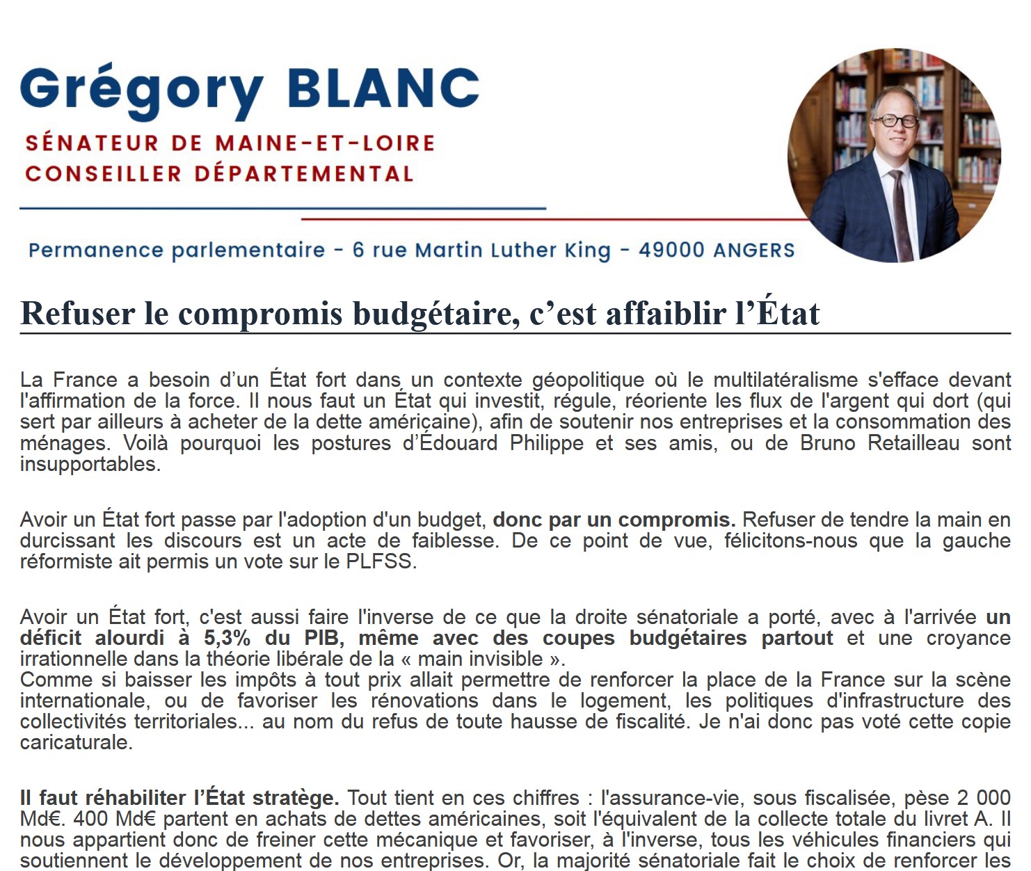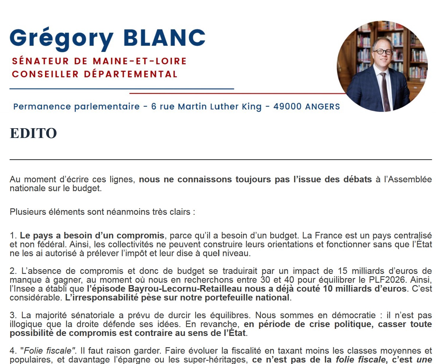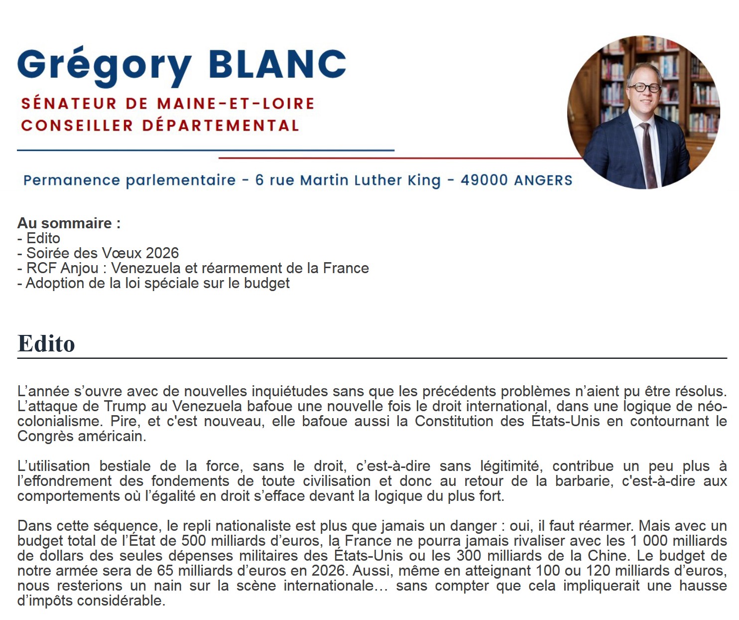 Newsletters Les dernières newsletters mensuelles de Grégory Blanc Recevoir ma newsletter Prénom* Nom* Mail* Commune Dernières newsletters Janvier 2026 Décembre 2025 Novembre 2025